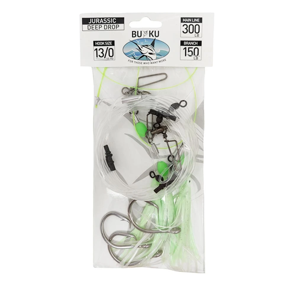 The Buku Jurassic Deep Drop Rig is built tough with ball bearing stainless snap swivels, heavy-duty crimps and Shinto Pro 13/0 stainless circle hooks. The 5m main line is 300lb with attached branches of 150lb. Also included is an 80lb break-away line for your weight. If you need extra branches you can add some Buku Jurassic Replacement Deep Drop Branches.