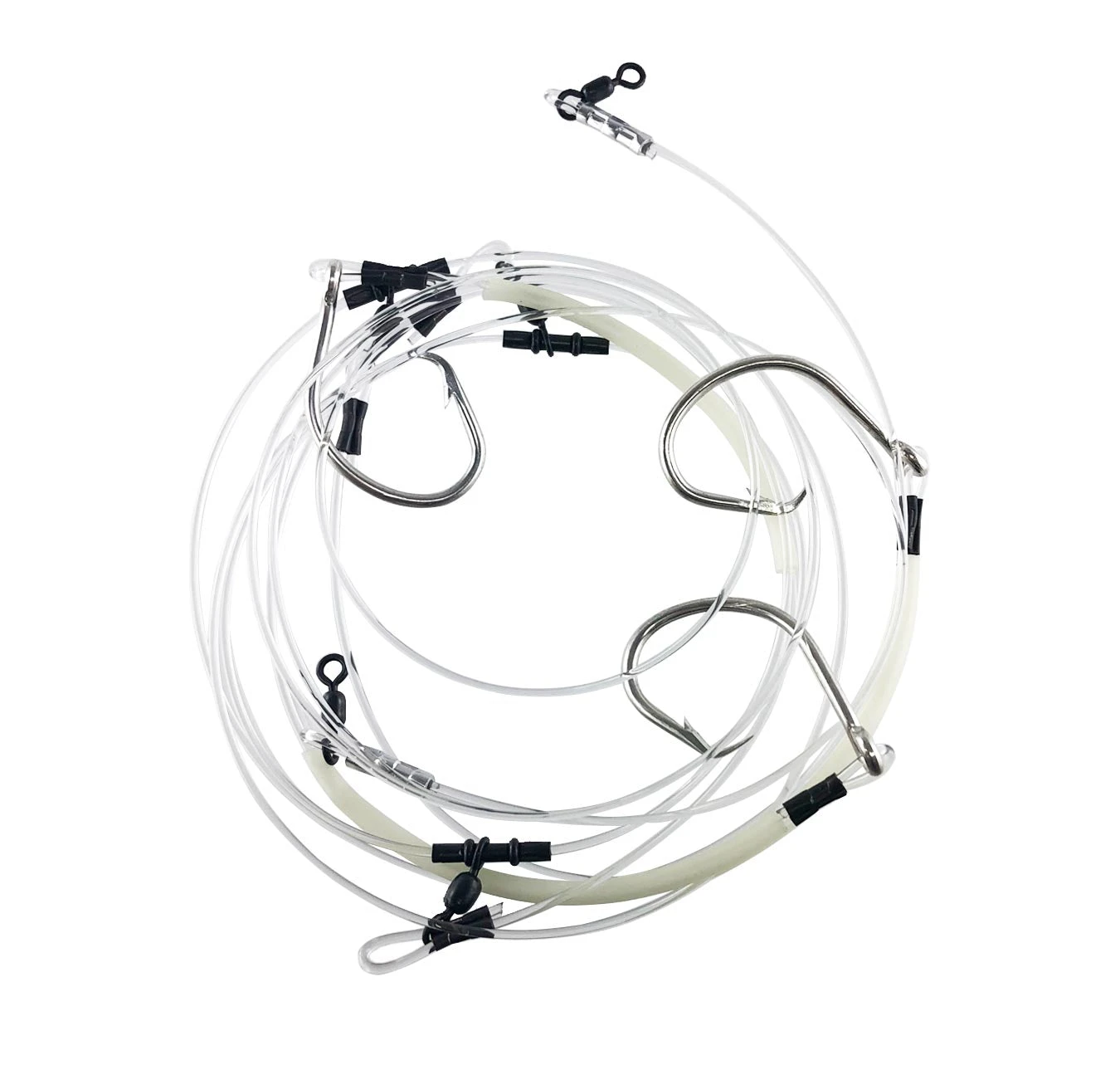 Rigged with Mustad 39960D Tuna Circle Hooks in either size 14/0 or 16/0 depending on the rig chosen, and 300lb mono.