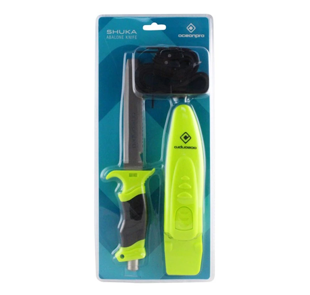 The Ocean Pro Shuka Abalone knife is perfect for prying off abalone from the rocks. The package comes with a line cutter, hammer butt, ‘Sure Lock’ case, leg/arm straps, and a nice bright fluoro yellow colour to increase the chances of recovery upon dropping the blade.