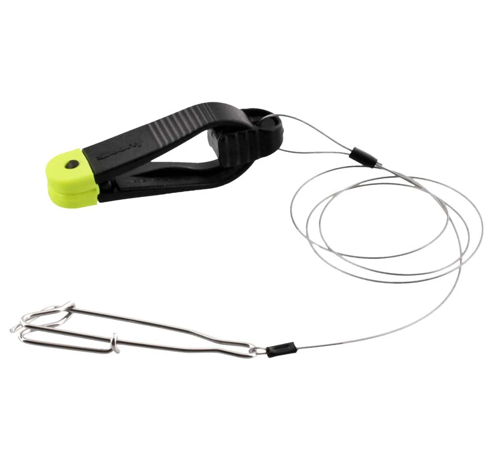 The Scotty Mini Power Grip Plus 1180 Downrigger Line Release Clip is fitted with an 18″ wire leader and a stackable self-locating snap, which is basically a shark clip but with a slightly different design to make sure it grabs the downrigger cable without slipping.