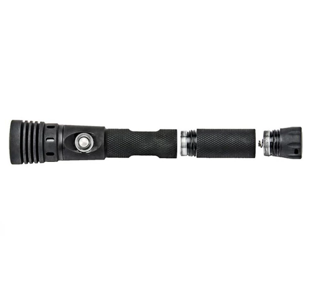 The Tovatec Fusion 400 Dive Torch is powered by a single 14500 Rechargeable Li-ion Battery, and has a 2 x AA alkaline battery extension option if a longer burn time is needed i.e. You can either use one 14500 battery or two AA batteries, you can’t use both together.