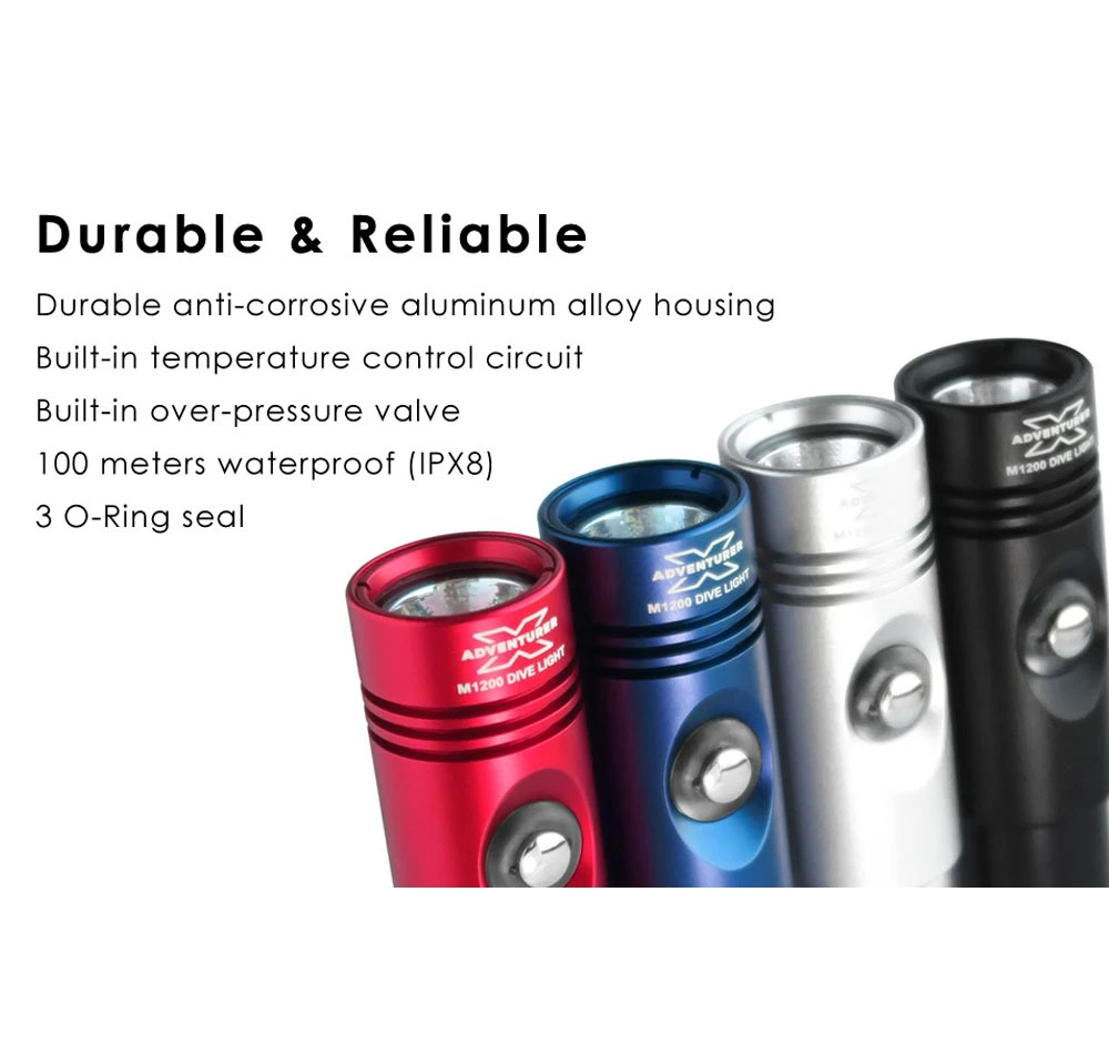 The X Adventurer M1200 LED torch is a lightweight, compact, durable and high output versatile dive torch. Simple one button operation makes it convenient and easy to use when scuba diving, lobster collecting or in outdoor activities.